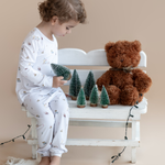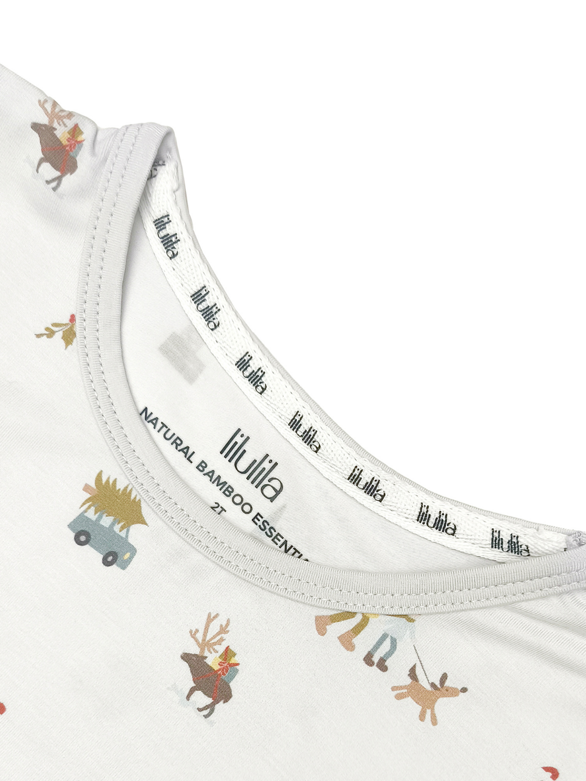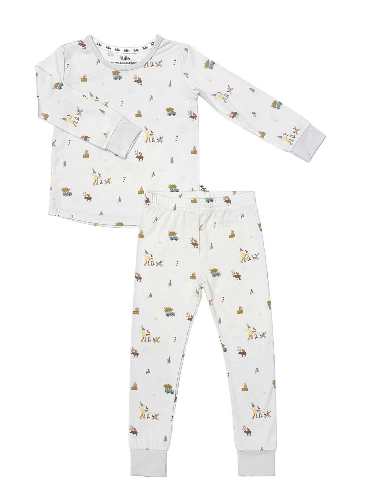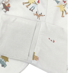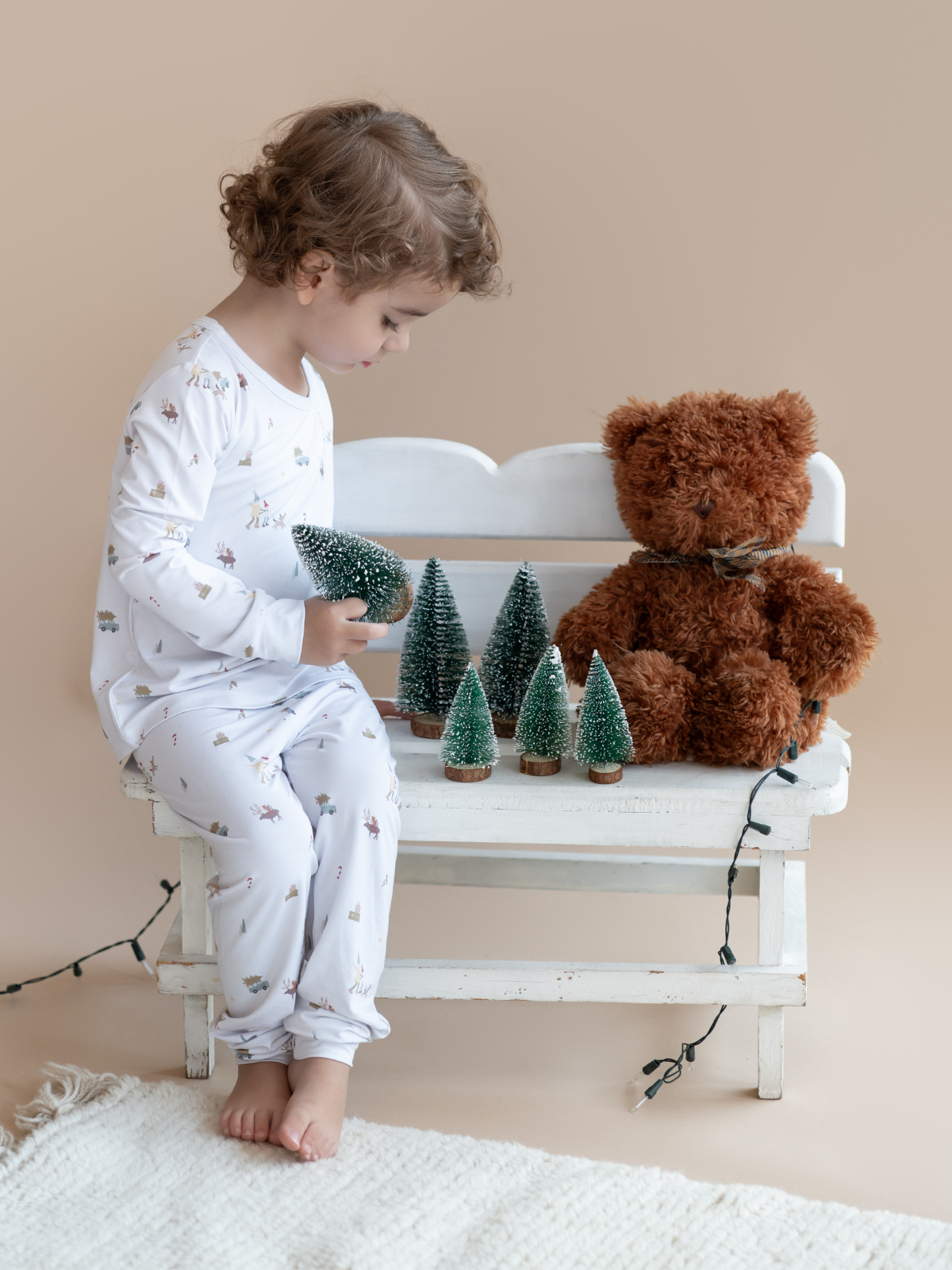 Settle in for story time in the softest seasonal PJs. Winter Village brings playful holiday scenes—kids, pup, reindeer, gifts, trees, holly, and candy canes—on a calming cream ground.