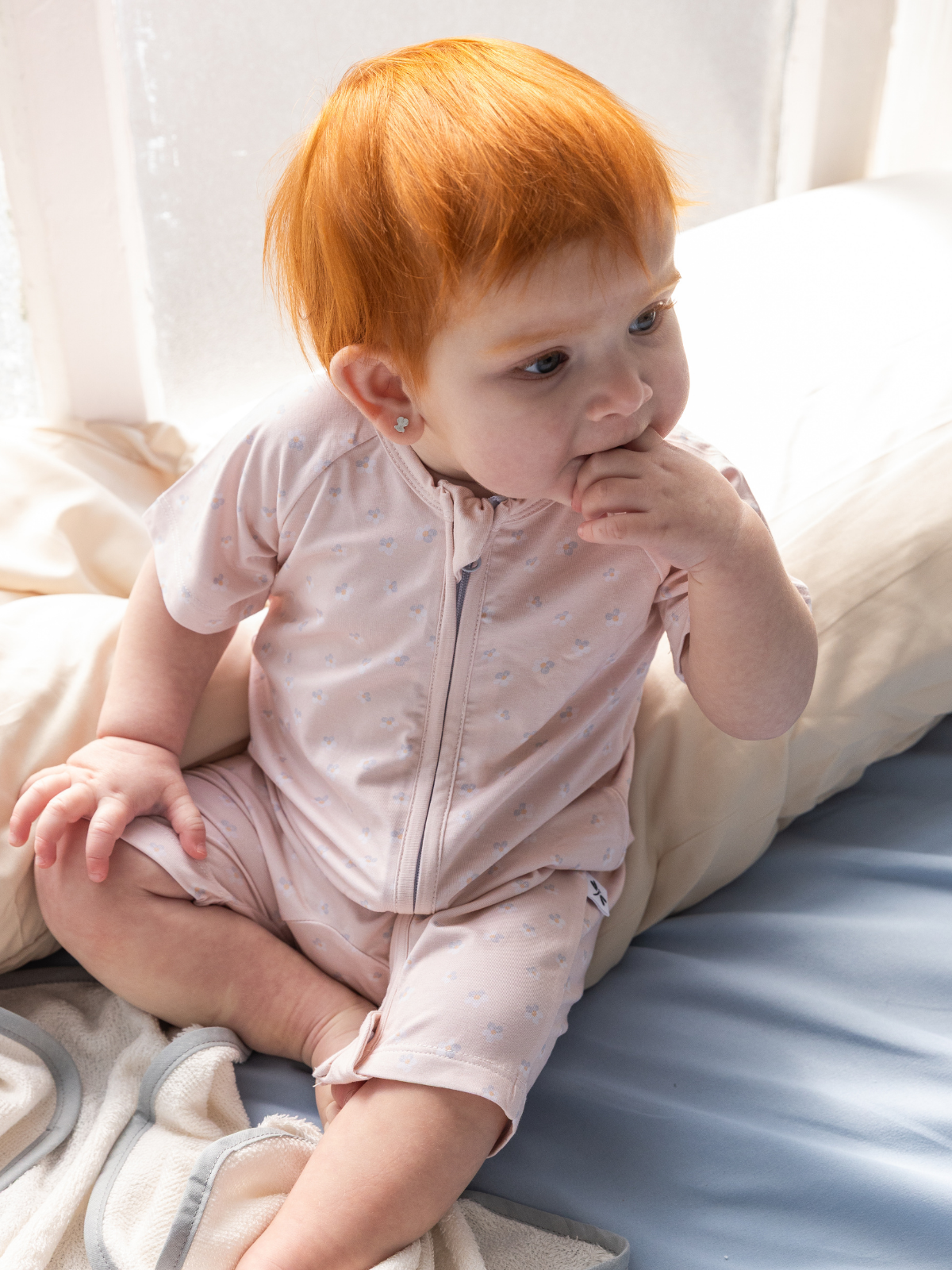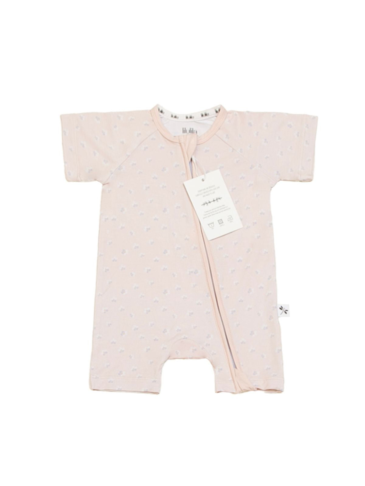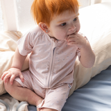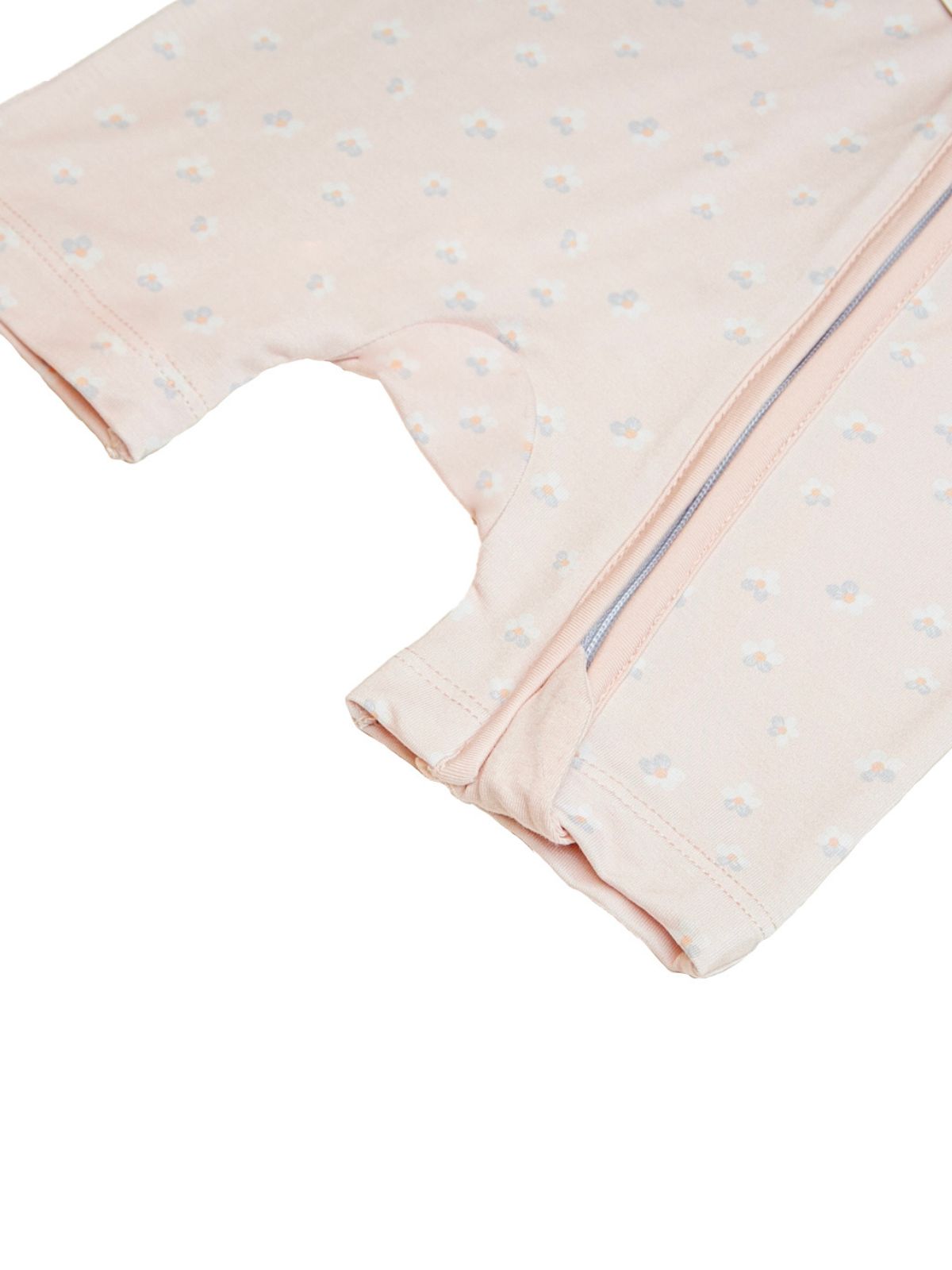 This adorable romper features a delicate print of tiny flowers on a soft coral background, exuding elegance. Its ultra-soft fabric is perfect for your little one's delicate skin, and the two-way zipper makes diaper changes a breeze. (No more struggles with buttons!)