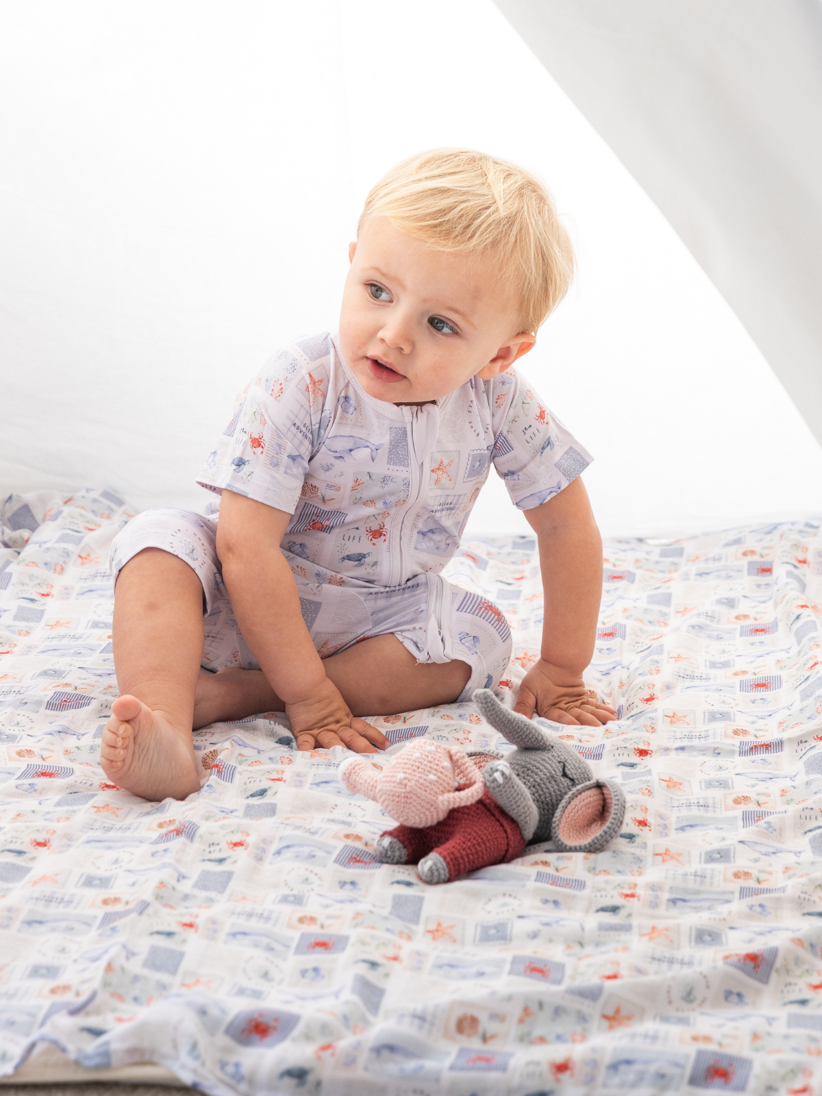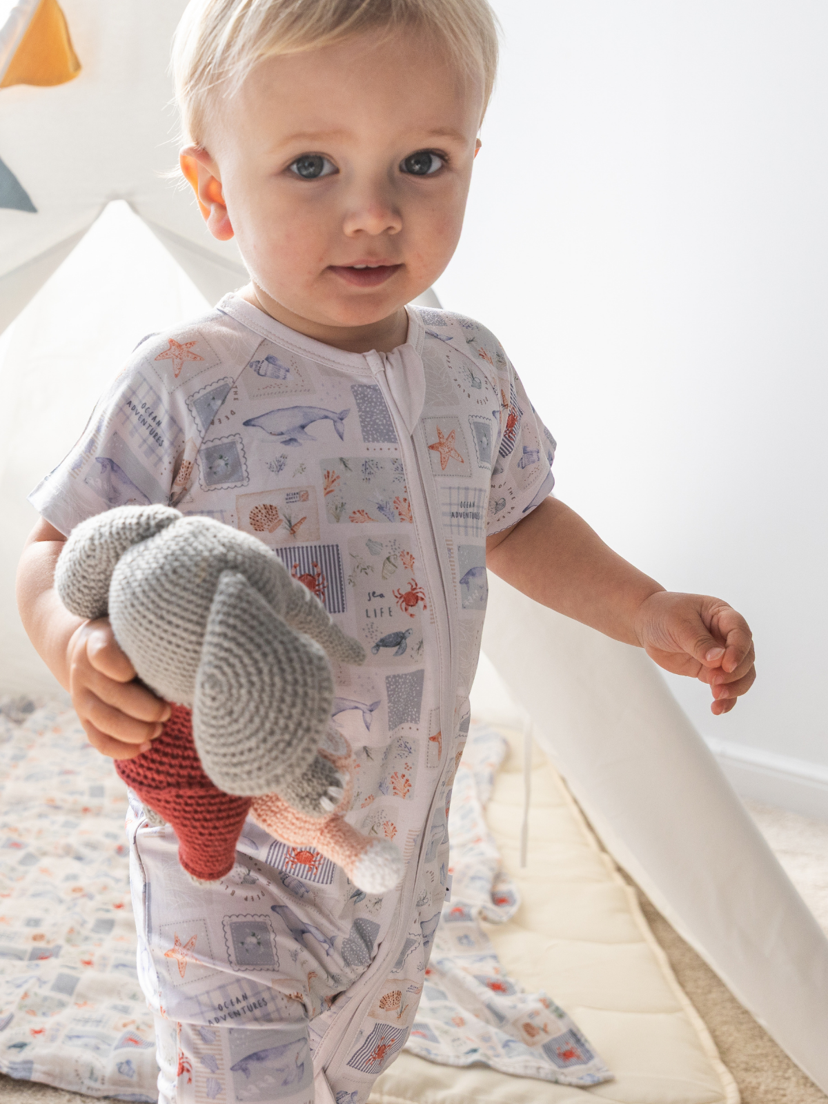 This Short Life Ocean Bamboo Zippy Romper is perfect for summer adventures. Made from soft, breathable bamboo fabric, it's like diving into a sea of comfort. It's playful design, inspired by the ocean, will have your little one ready for any discovery. Say goodbye to bulky outfits and hello to the most practical romper ever!