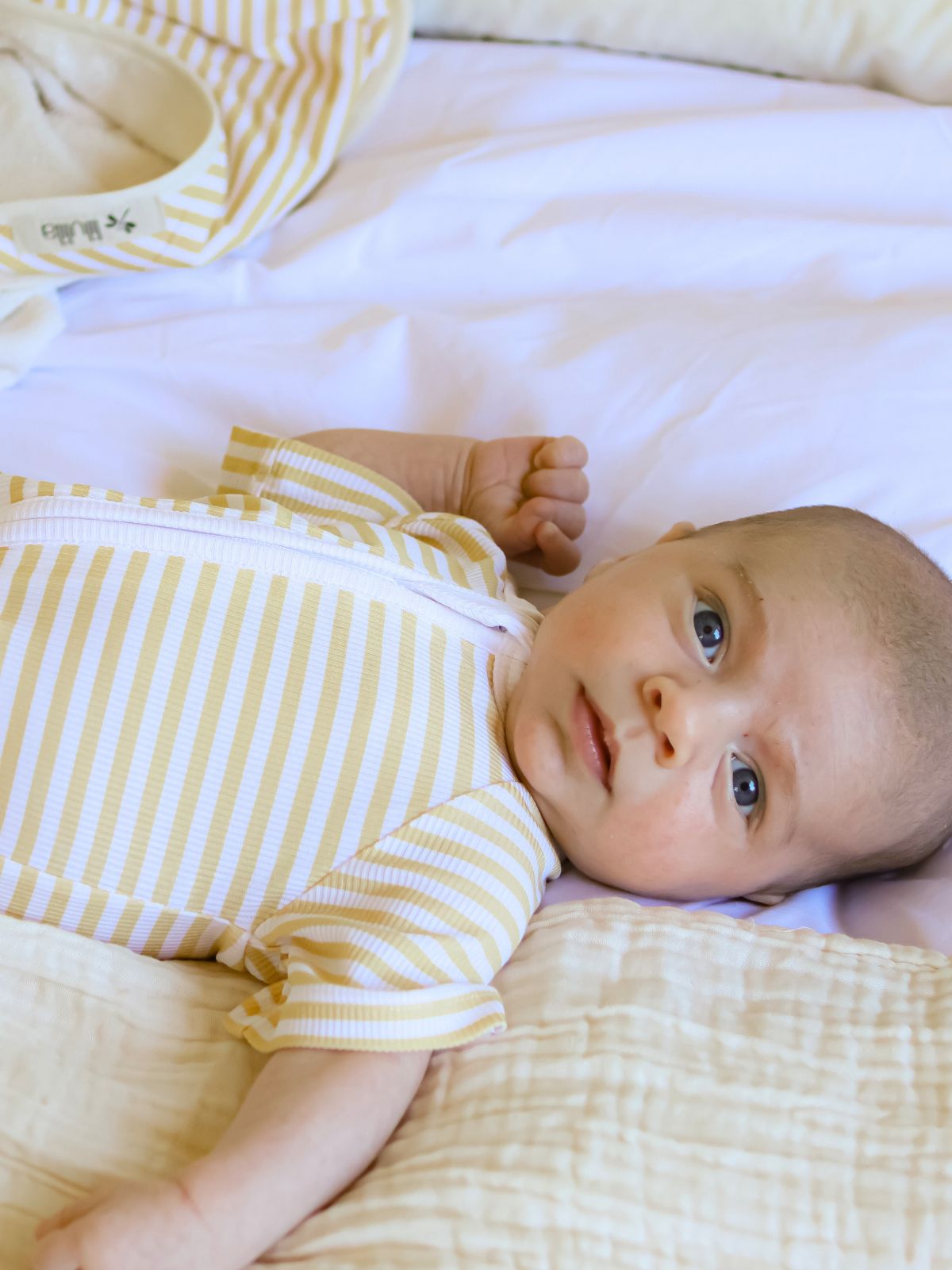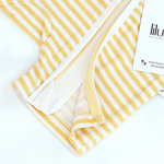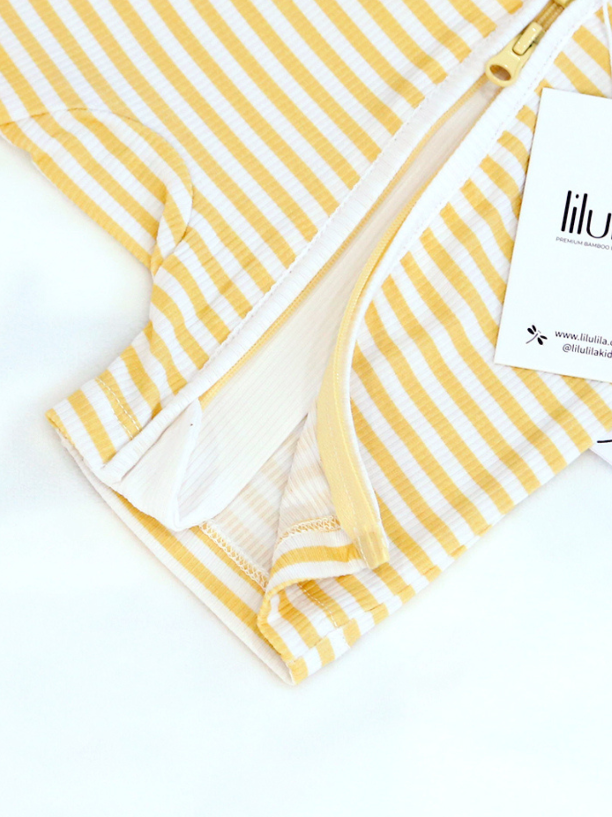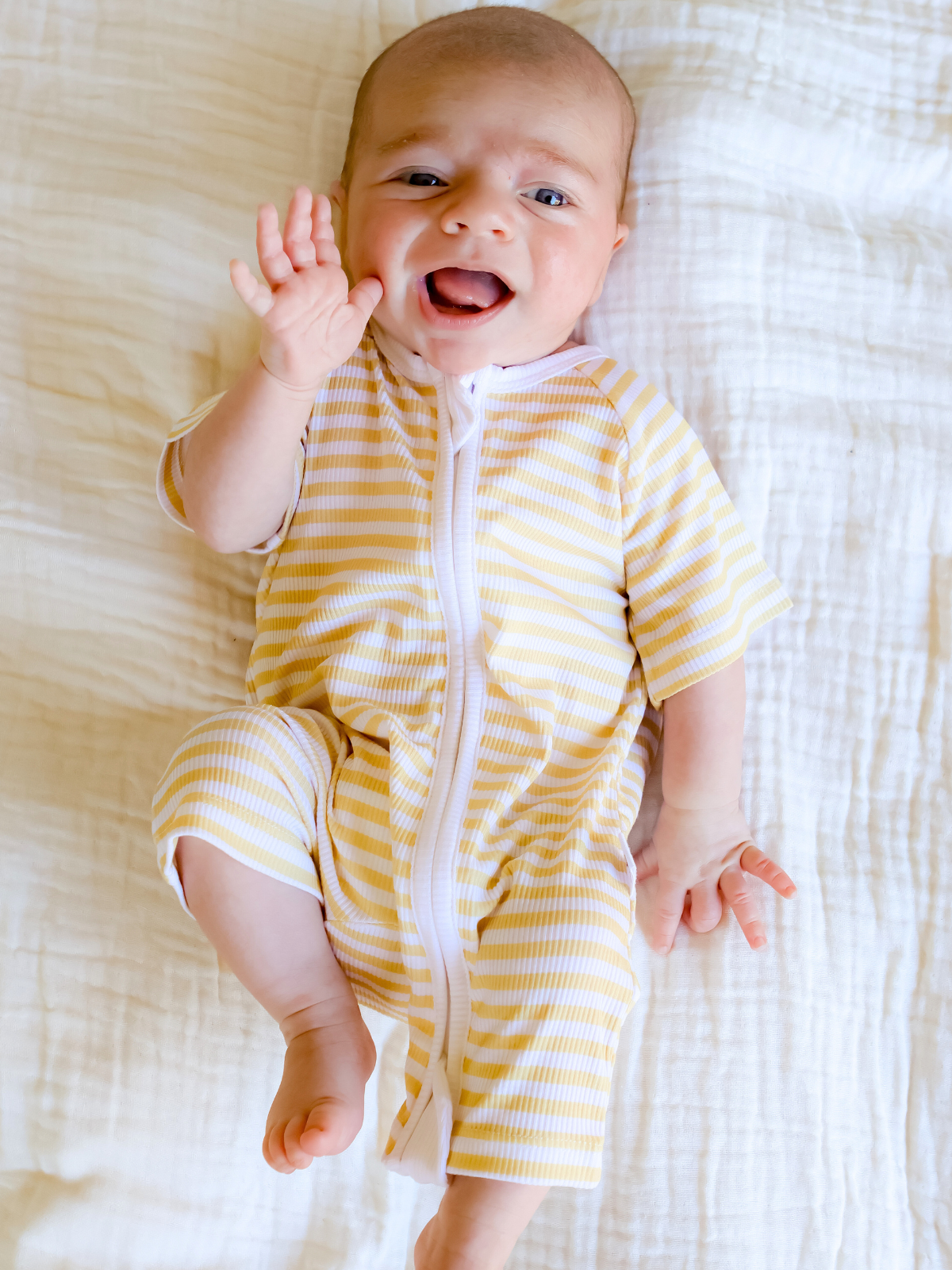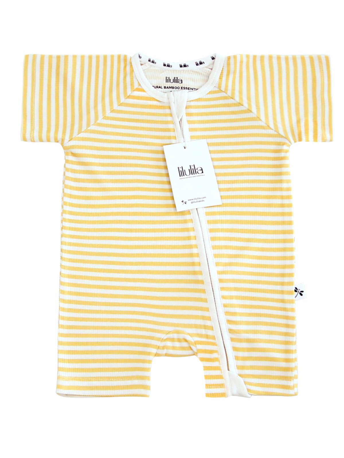 Get ready for a fresh and playful look with our Short Yellow Stripes Bamboo Zippy Romper! Made with bamboo ribbed fabric, this romper is soft and comfortable for your little one. With a unique two-way zipper, changing diaper and outfit changes will be a breeze. Perfect for siblings to match, this romper adds a touch of fun to any adventure!