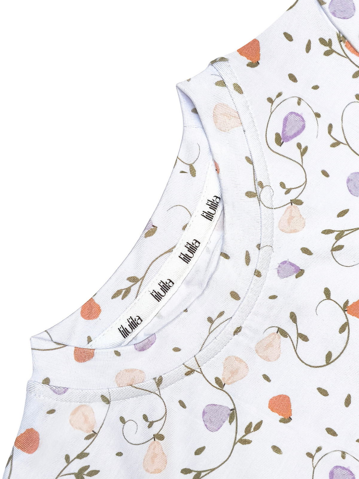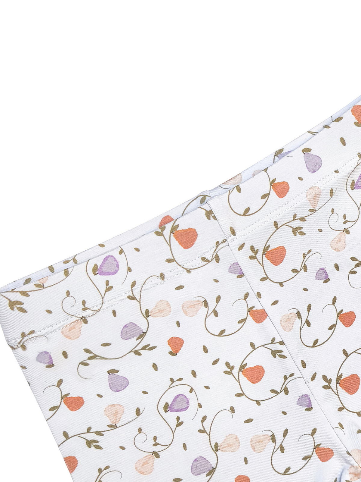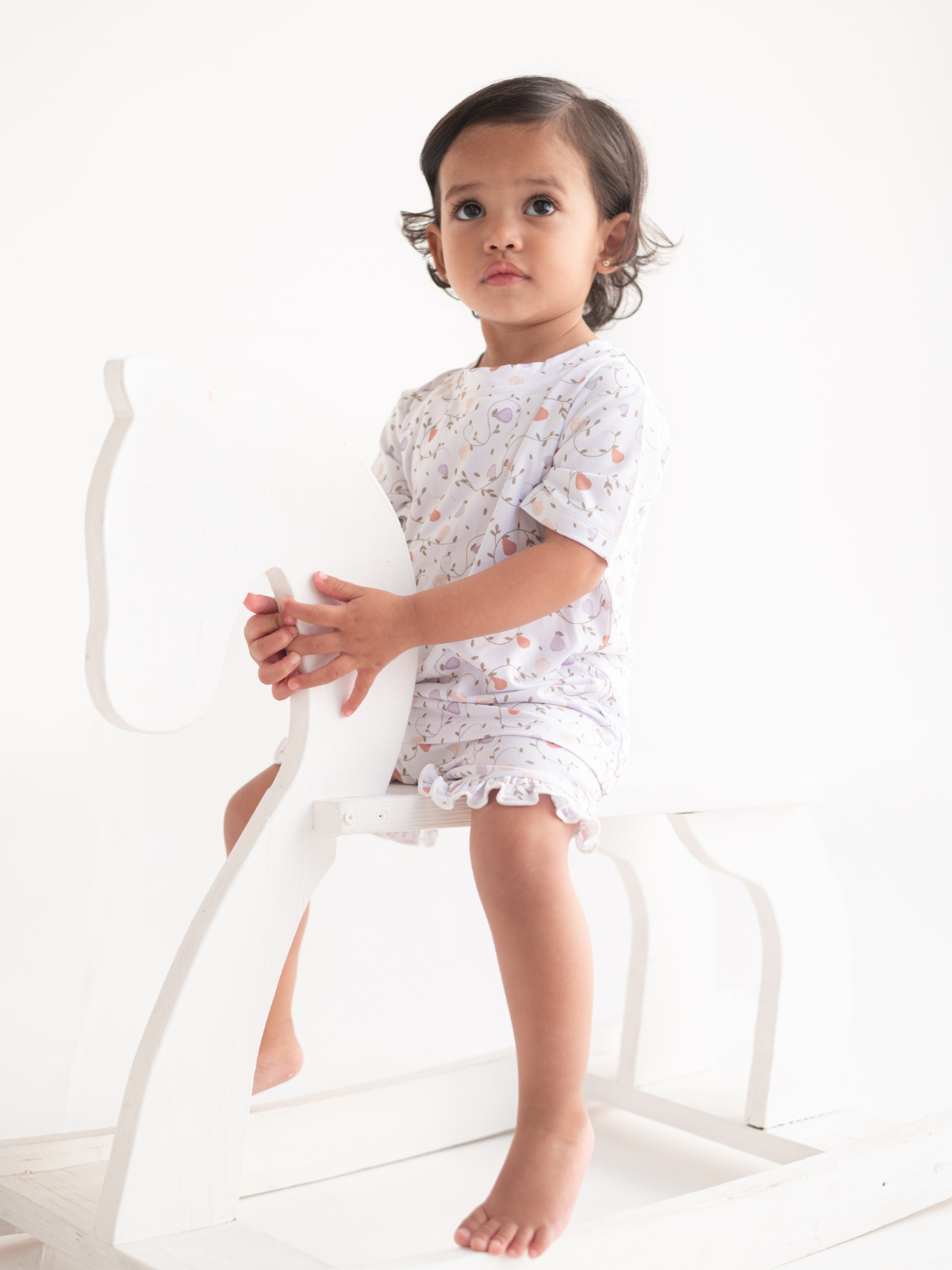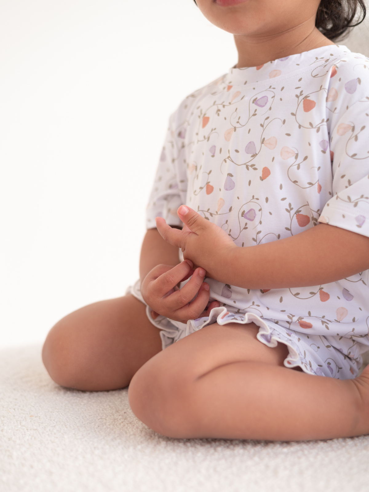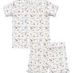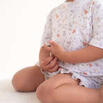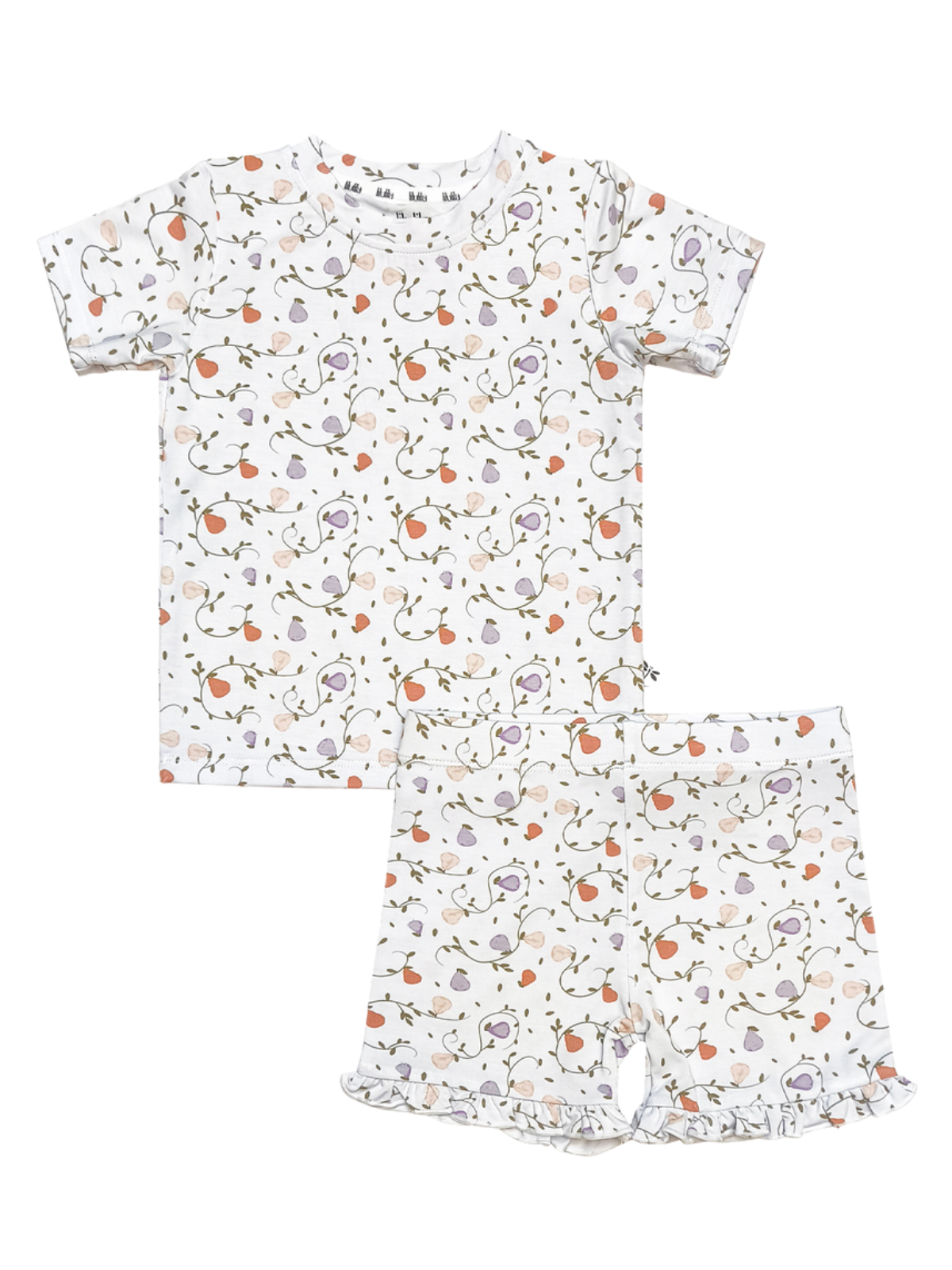 Soft pears and winding vines create a peaceful, nature-inspired print on this bamboo girls pajama set. The airy short sleeves and subtle ruffle detail make it extra sweet for bedtime.