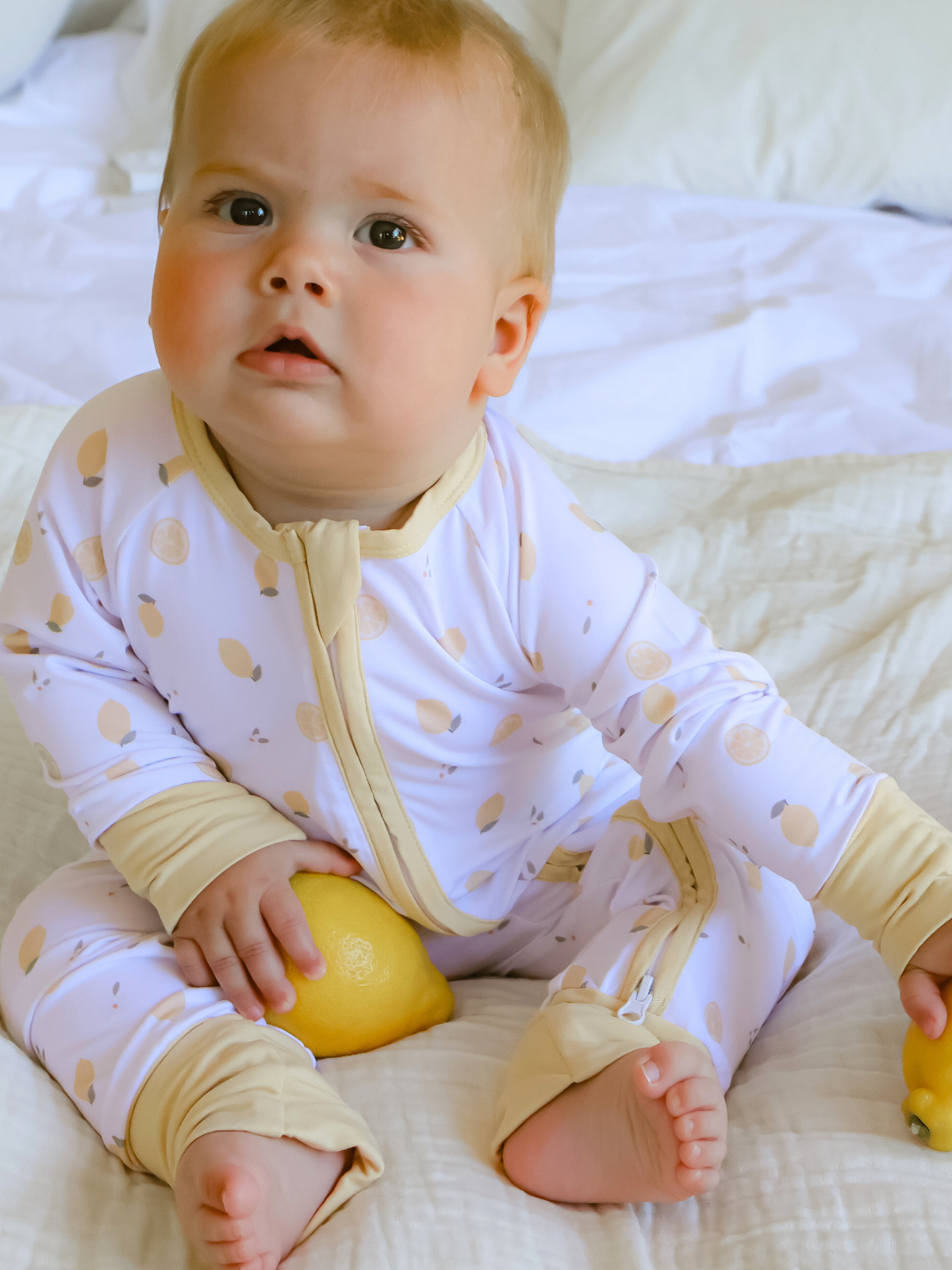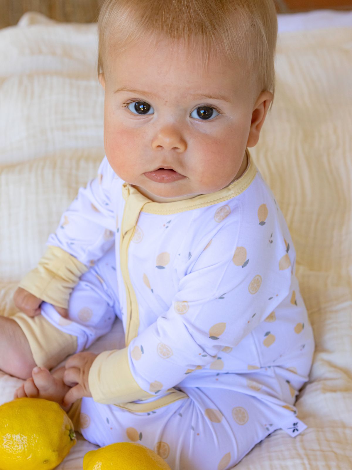 El pelele Lemons Bamboo Zippy es una opción divertida para tu pequeño. El estampado de limones es a la vez refrescante y elegante, mientras que el pelele con cremallera tiene una cremallera bidireccional para vestirlo y cambiarlo fácilmente.